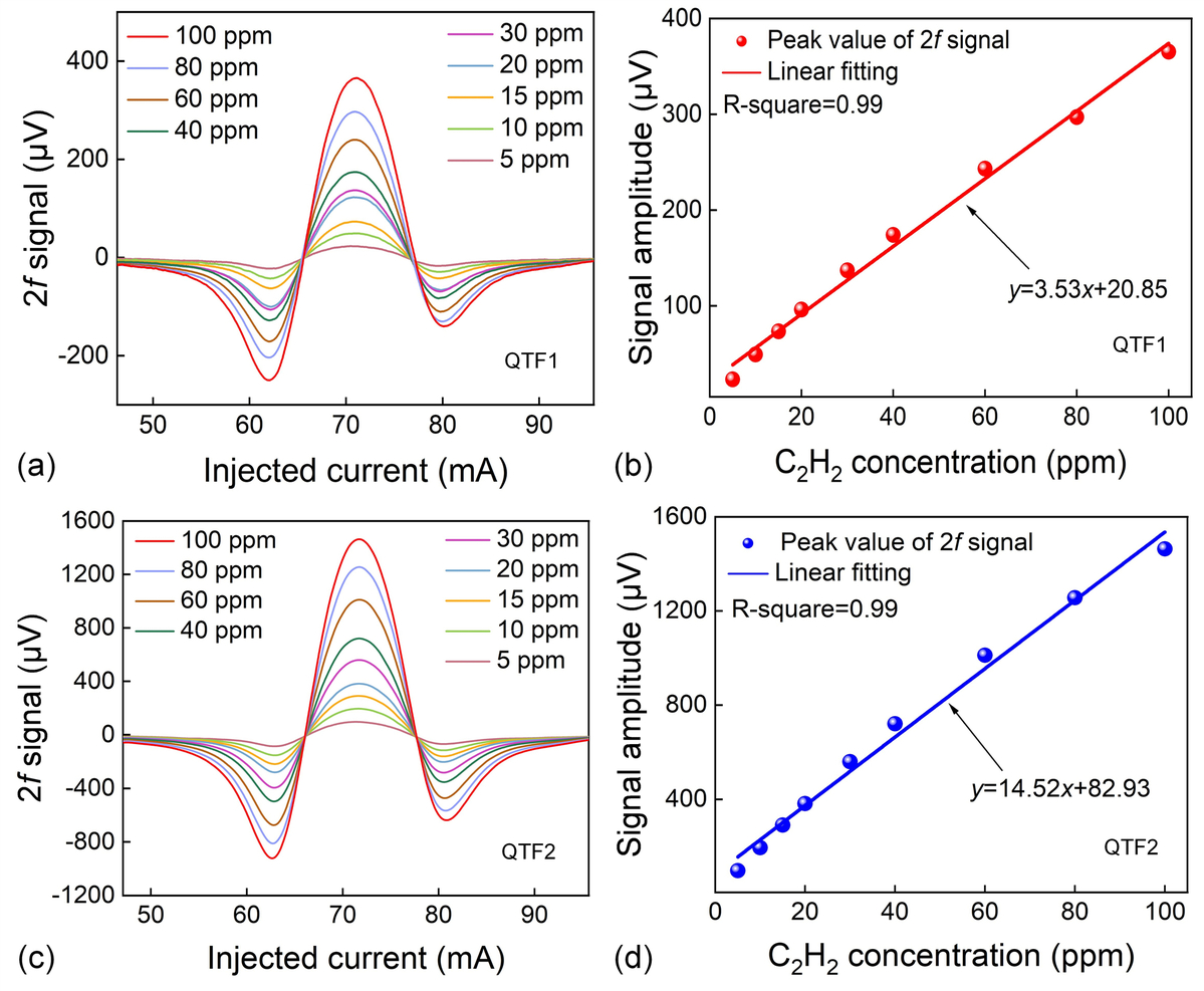 基于商用石英音叉(QTF1)和圆形头石英音叉(QTF2)的C2H2-LITES传感性能测设:a.不同C2H2浓度下2f信号峰值(QTF1);b.浓度线性响应(QTF1);c.不同C2H2浓度下2f信号峰值(QTF2);d.浓度线性响应(QTF2)。
