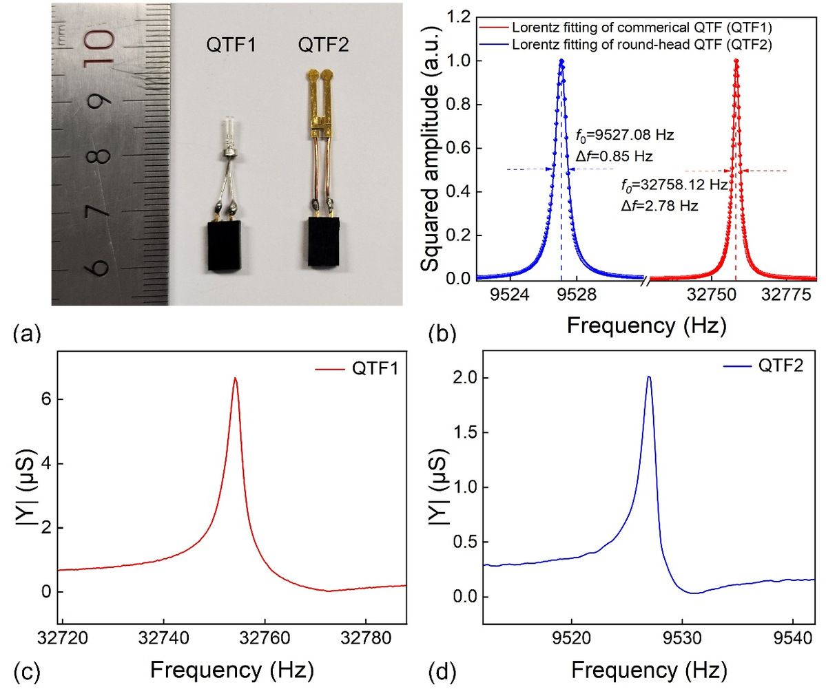 商用石英音叉与自主设计的圆形头石英音叉对比:a. 商用石英音叉(QTF1)与圆形头石英音叉(QTF2)的实物图;b. 商用石英音叉与圆形头石英音叉的共振频率图;c. 商用石英音叉的导纳特性曲线;d. 圆形头石英音叉的导纳特性曲线。
